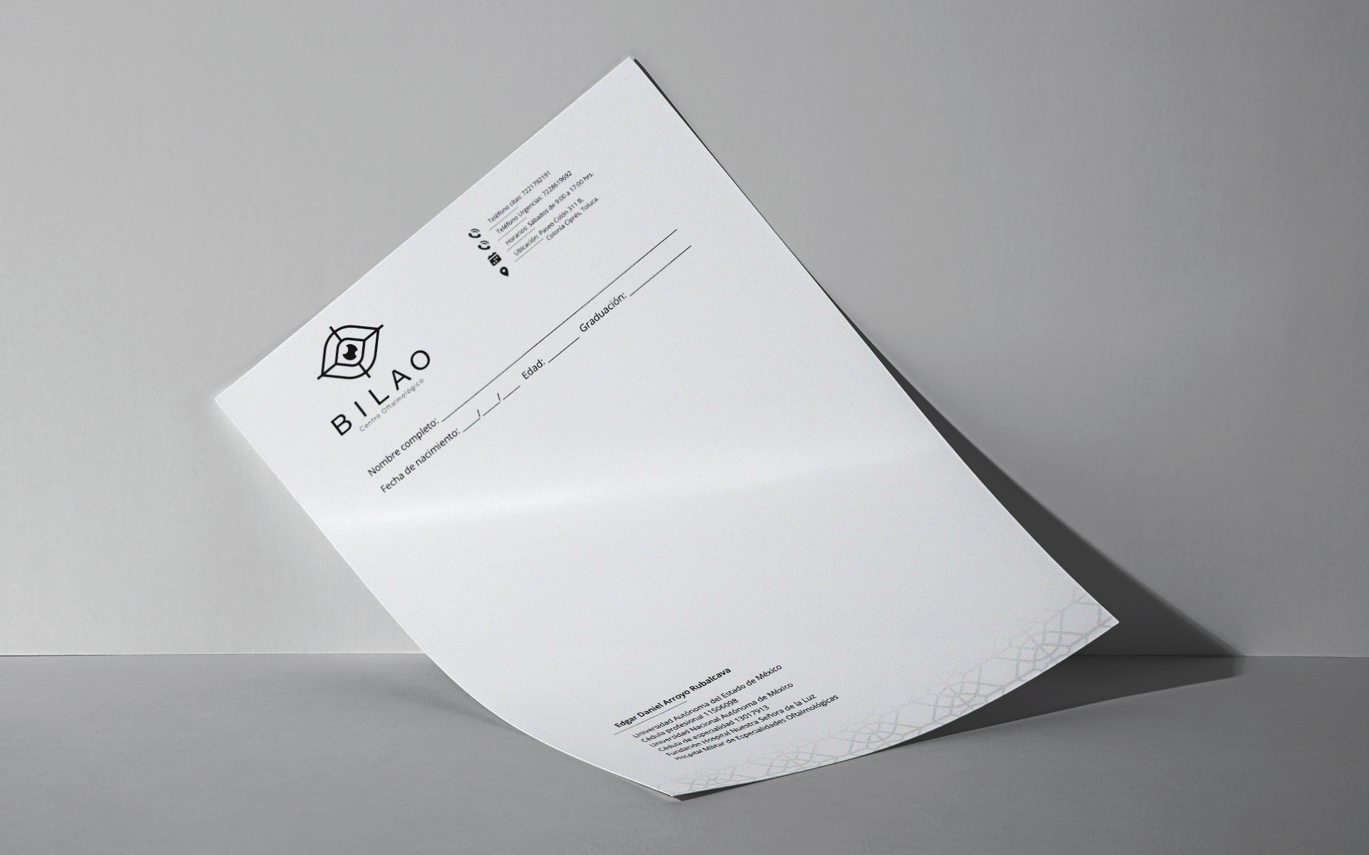 El logotipo final combina formas geométricas inspiradas en los equipos de diagnóstico ocular con una tipografía limpia y sobria. La identidad visual resultante equilibra el rigor clínico con una estética amable, adecuada para una clínica que apuesta por la tecnología y la empatía al mismo nivel. El uso del negro como base aporta elegancia y profesionalismo, ayudando a posicionar a Bilao como un centro médico de alta especialidad en Toluca.